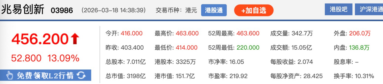 上证报中国证券网讯3月18日午后,港股半导体板块走强。截至14时38分,兆易创新H股涨13.09%,报456.2港元/股,成交额约15.05亿港元,总市值约3198亿港元。
