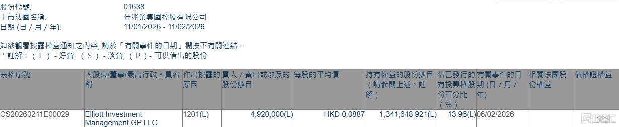 格隆汇2月11日丨根据联交所最新权益披露资料显示,2026年2月6日,佳兆业集团(01638.HK)遭Elliott Investment Management GP LLC在场内以每股均价0.0887港元减持492万股,涉资约43.64万港元。