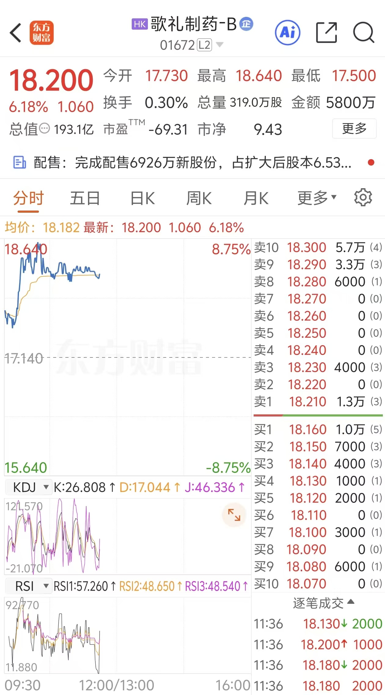 上证报中国证券网讯2月11日早盘,歌礼制药-B一度涨超8%,最高报18.64港元/股。截至11时37分,歌礼制药-B报18.2港元/股,涨6.18%。