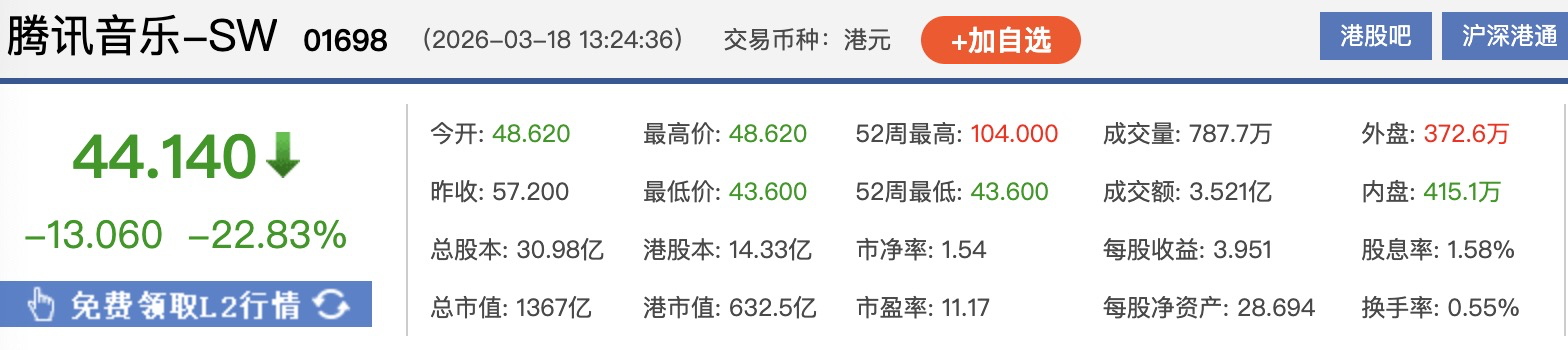 上证报中国证券网讯3月18日午后,腾讯音乐-SW延续跌势。截至13时24分,腾讯音乐-SW跌22.83%,报44.14港元/股,成交额约3.521亿港元,总市值约1367亿港元。同时,网易云音乐跌8.95%。