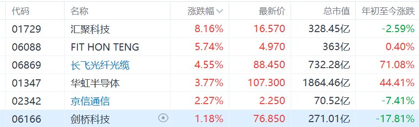 港股光通讯股走强:汇聚科技涨超8%,长飞光纤光缆涨超4%