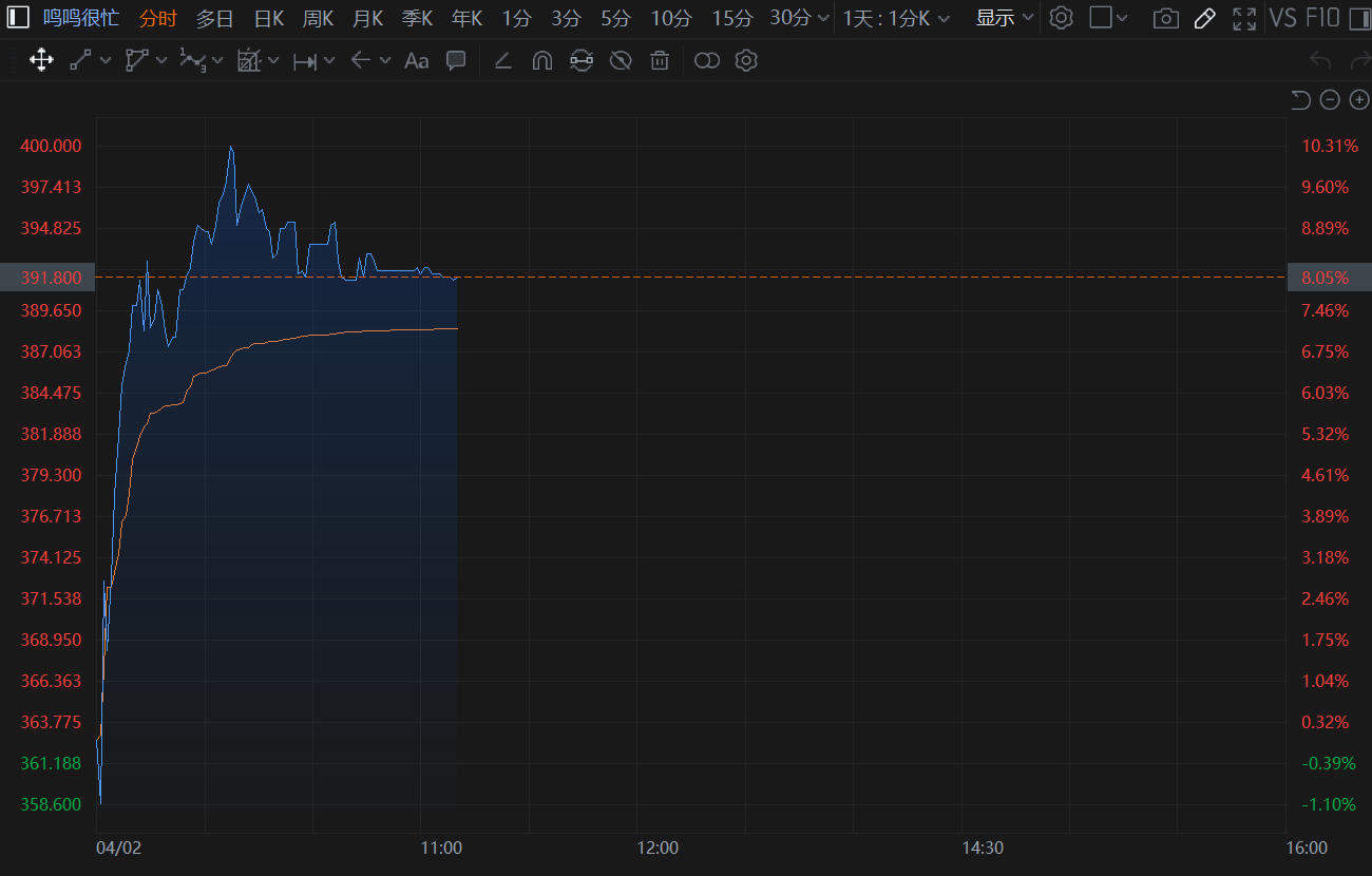 鸣鸣很忙(1768.HK)盘初拉升一度涨超10%,股价重回400港元,总市值853.5亿港元。