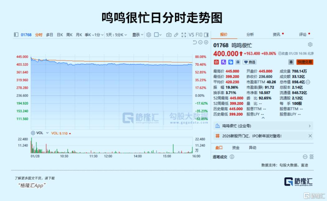 作为“港股量贩零食第一股”,鸣鸣很忙上市首日开盘即大涨88.08%,最高触及445港元,对应总市值突破950亿港元,截至发稿涨幅收窄至70%附近,上演了一场现象级行情。