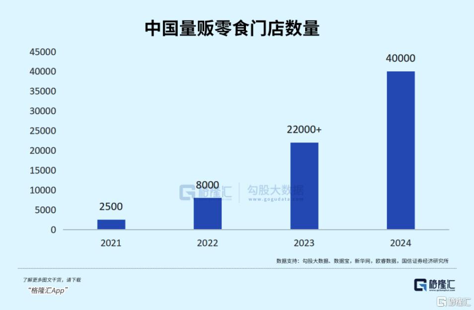 因此,可以看到,量贩零食业态呈现爆发式增长态势。据国信证券数据,全国量贩零食门店数量从2021年的2500家激增至2024年的40000+家。