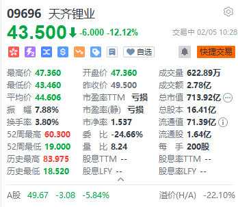 港股异动 | 碳酸锂期货大跌 天齐锂业H股跌逾12%