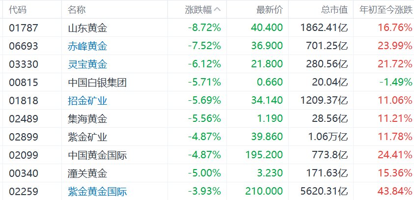 港股异动丨金银价格重挫,相关概念股集体下跌,山东黄金跌超8%,赤峰黄金跌超7%