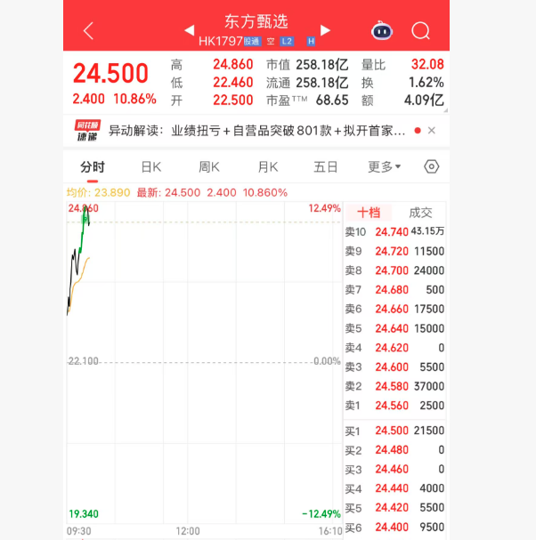 上证报中国证券网讯1月29日,东方甄选高开高走,截至9时58分,报24.50港元/股,涨10.86%,成交额4.09亿港元。