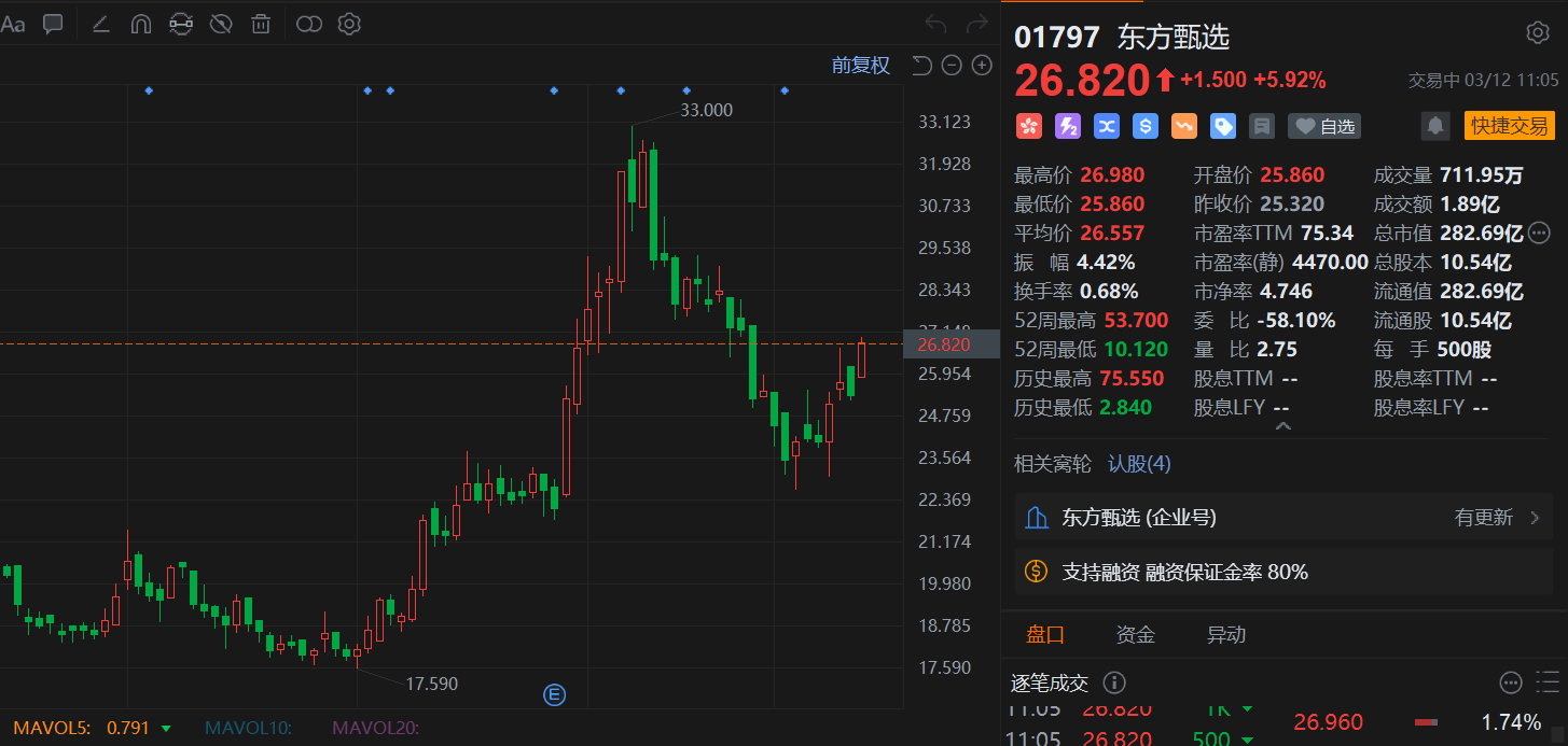 港股异动丨东方甄选逆势上涨6% 俞敏洪增持+机构唱好