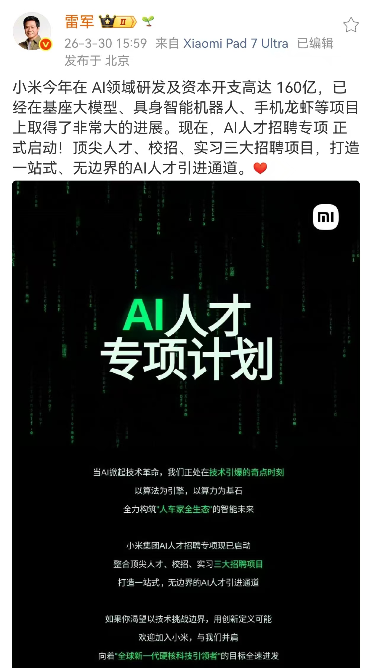 上证报中国证券网讯 小米集团创始人、董事长兼CEO雷军3月30日在其个人微博宣布,小米今年AI领域研发及资本开支高达160亿元。同时,小米正式启动AI人才招聘专项计划,开放顶尖人才、校园招聘、实习三大招聘赛道,打造一站式、无边界的AI人才引进体系。