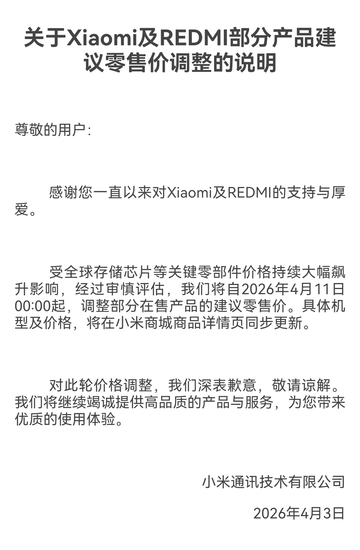 上证报中国证券网讯小米4月3日官宣:受全球存储芯片等关键零部件价格持续大幅飙升影响,经过审慎评估,公司将自2026年4月11日00:00起,调整部分在售产品的建议零售价。