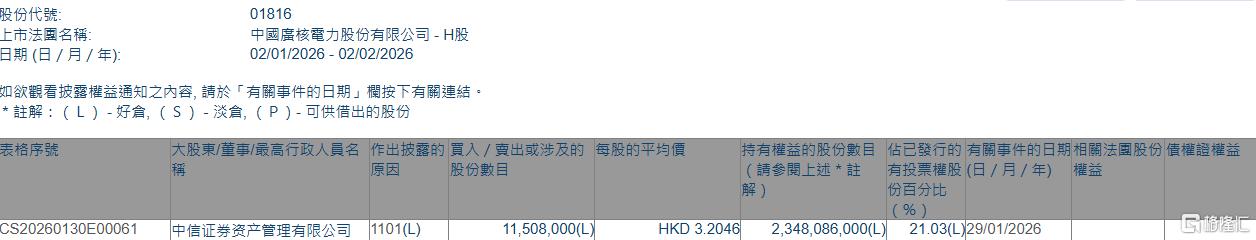 格隆汇2月2日丨根据联交所最新权益披露资料显示,2026年1月29日,中广核电力(01816.HK)获中信证券资产管理有限公司在场内以每股均价3.2046港元增持1150.8万股,涉资约3687.85万港元。
