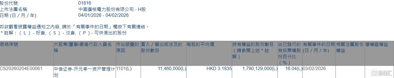 中广核电力(01816.HK)获中信证券-开元单一资产管理计划增持1146万股