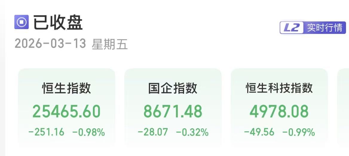 上证报中国证券网讯3月13日,港股三大指数收跌。截至收盘,恒生指数跌0.98%,报25465.6点;恒生国企指数跌0.32%,报8671.48点;恒生科技指数跌0.99%,报4978.08点。