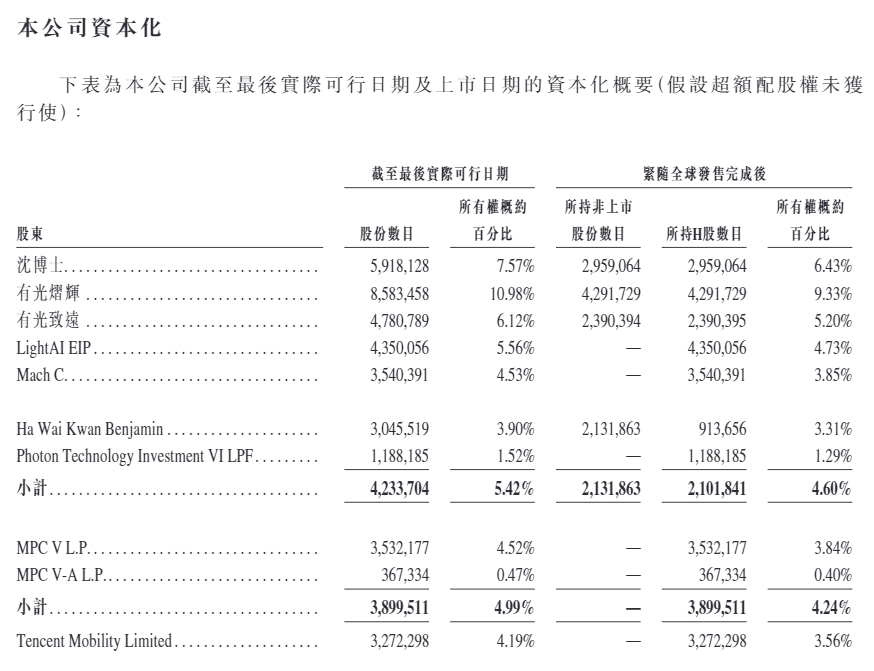 股权结构上,在全球发售完成后,沈亦晨将直接行使公司约6.43%的投票权,且亦将通过与LightAI EIP、Mach C及有光致远的一致行动协议控制本公司约13.78%的投票权。同时,有光烁然为曦智科技股份激励平台之一有光熠辉的普通合伙人,其由沈亦晨持有80%的权益。沈亦晨亦将控制由有光熠辉持有的本公司9.33%的投票权。