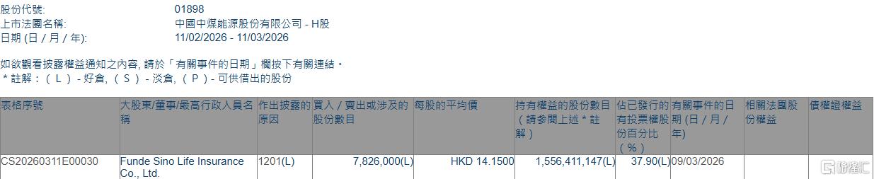格隆汇3月11日丨根据联交所最新权益披露资料显示,2026年3月9日,中煤能源(01898.HK)遭Funde Sino Life Insurance Co., Ltd.在场内以每股均价14.15港元减持782.6万股,涉资约1.11亿港元。