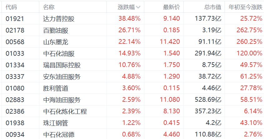 百勤油服涨26%,山东墨龙涨22%,