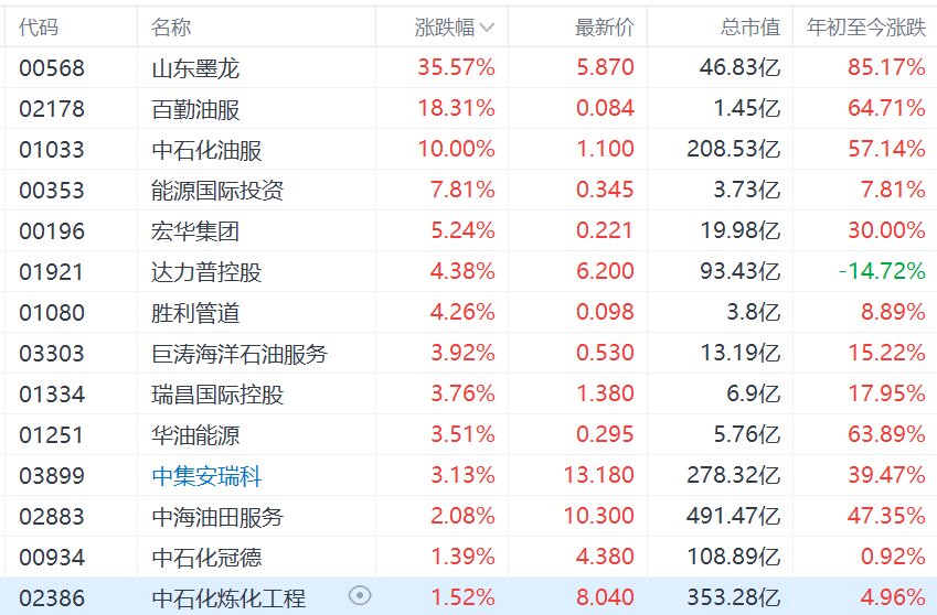 港股市场油气设备与服务股集体飙升,其中,山东墨龙飙升超35%,百勤油服涨超18%,中石化油服涨10%,能源国际投资涨超7%,宏华集团涨超5%,达力普控股、胜利管道涨超4%,巨涛海洋石油服务、瑞昌国际控股、华油能源、中集安瑞科涨超3%。