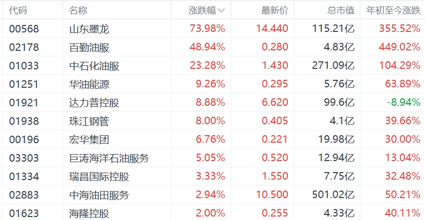 港股异动丨油气设备与服务股飙升,山东墨龙暴涨超70%,百勤油服涨近50%