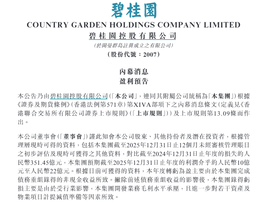由此可见,碧桂园赶在2026年到来前“卡点”完成债务重组,成为2025年财报“扭亏为盈”的关键。