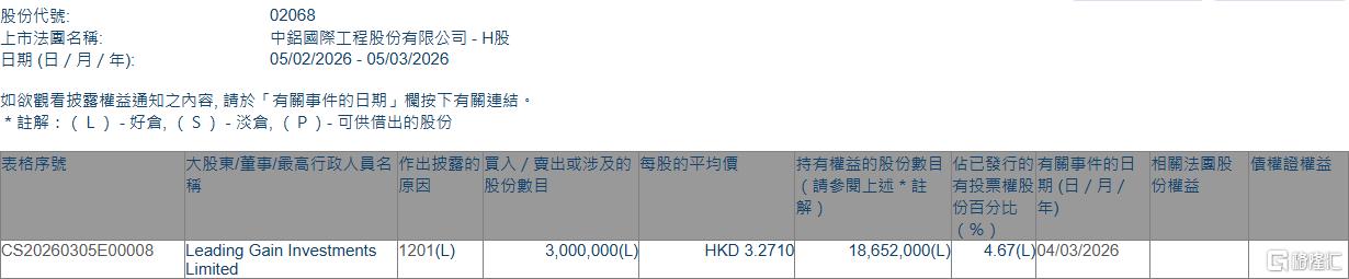 中铝国际(02068.HK)遭Leading Gain Investments Limited减持300万股