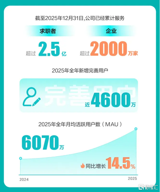 截至2025年12月31日止的十二个月内,公司付费企业客户数达到680万,同比上涨11.5%。截至2025年12月31日,公司累计服务超过2.5亿求职者,服务企业总数超过2000万家
