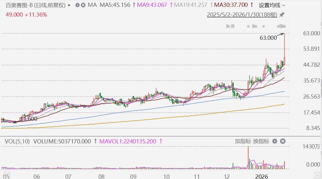 2025年净利同比预增384.26%-443.88%,刺激百奥赛图AH股齐涨。A股一度大涨超18%至78.75元,创上市新高;H股一度飙升超43%至63港元,股价亦创上市新高。
