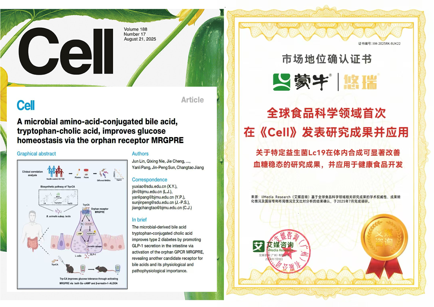 以创新驱动,打造新质生产力。蒙牛自主研发的新款HMOs再次获批,“活性锁鲜工艺”得到国际先进认证,自研益生菌Lc19、Hi188相继登上国际顶刊,并通过产学研“高速公路”实现成果转化,为精准营养提供系统性解决方案。蒙牛凭借“含有DHA藻油的调制乳及其生产方法”发明专利,一举荣获第二十五届中国专利银奖,并在全球乳业大会上获得2025世界乳品三项创新大奖,全面彰显其科研实力和创新引领地位。
