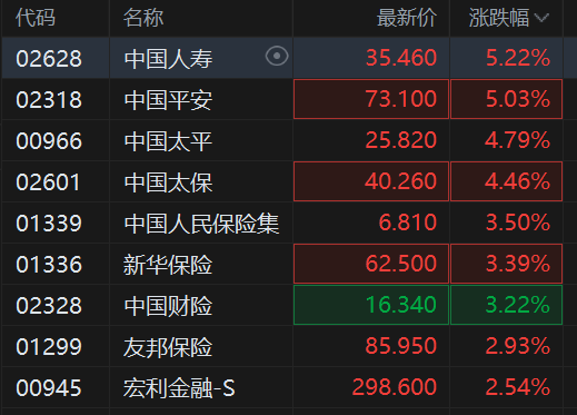 中国太平涨4.8%,中国太保涨4.5%,