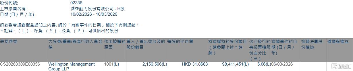 格隆汇3月10日丨根据联交所最新权益披露资料显示,2026年3月6日,潍柴动力(02338.HK)获Wellington Management Group LLP在场内以每股均价31.8683港元增持215.66万股,涉资约6872.7万港元。