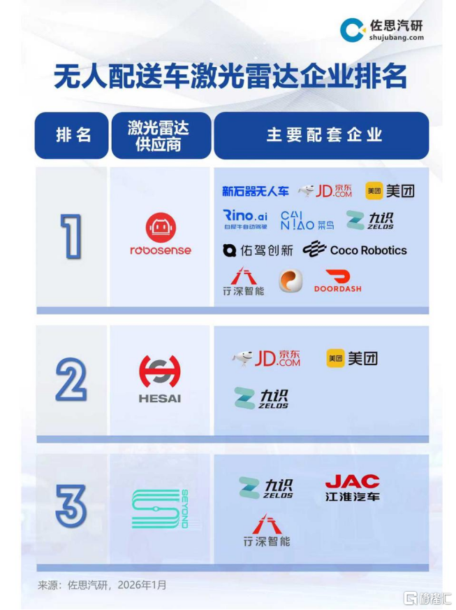 作为无人配送领域超90%头部企业的首选伙伴,速腾聚创已与新石器、九识智能等头部企业实现深度技术适配与规模化供货。目前,速腾聚创在无人配送车激光雷达市场占据绝对领先地位,搭载量稳居行业第一。