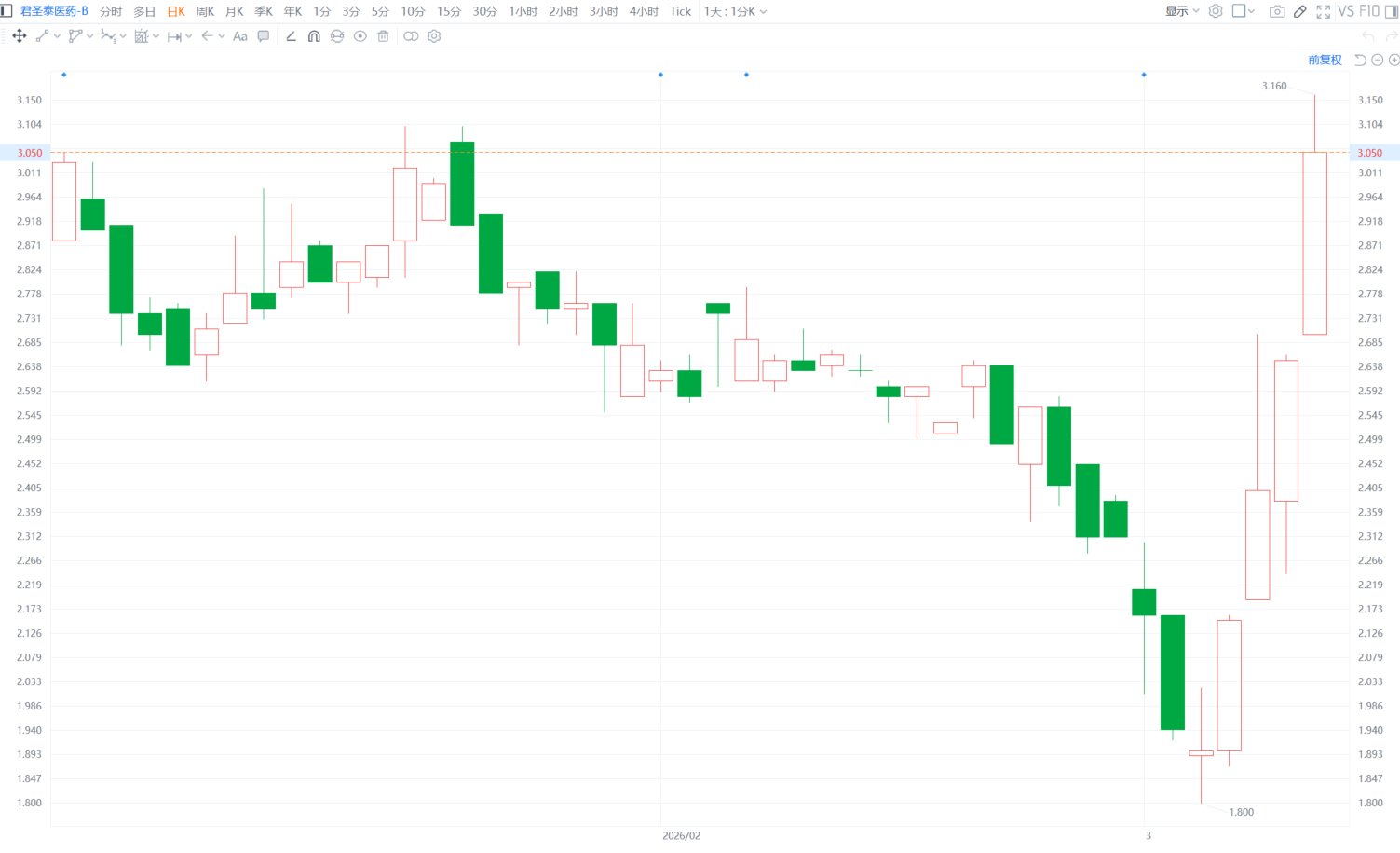 消息面上,君圣泰医药今年2月上旬举行投资者会议,系统阐述了其以“一药多效”策略引领心肾代谢系统疾病(CKM)综合治疗新时代的战略布局,并解读了多项关键临床进展。华通证券国际曾指,“一药多效”核心产品HTD1801商业化进程提速在即,CKM基石疗法市场空间广阔,给予公司目标价5.78港元,首予“推荐”评级。