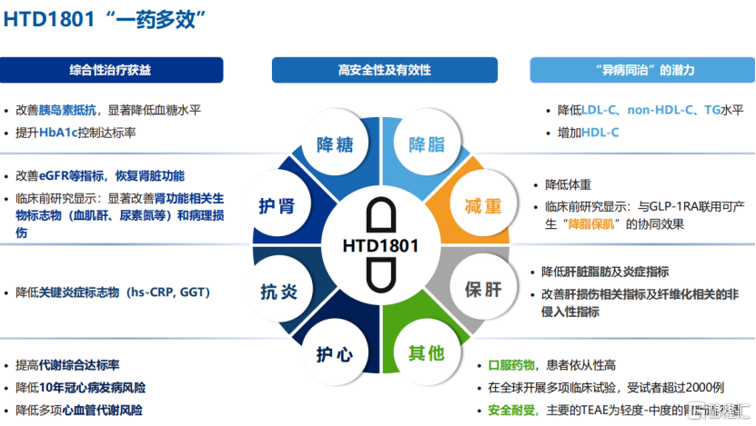 综合来看,HTD1801绝不是传统的降糖药物。它能够为合并血脂异常、慢性炎症及早期器官损伤的CKM患者提供涵盖心、肾、肝、代谢的综合临床获益,从而在竞争激烈的治疗领域中建立起清晰的差异化优势与独特的价值定位。