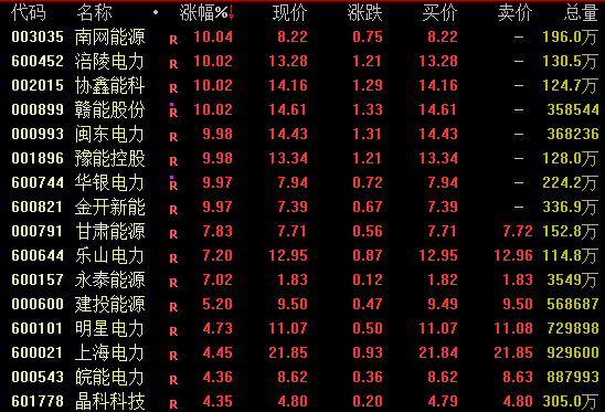 电力板块盘中强势拉升,截至收盘,南网能源、涪陵电力、协鑫能科等涨停,赣能股份连续3个交易日涨停,豫能控股(001896)斩获7连板。