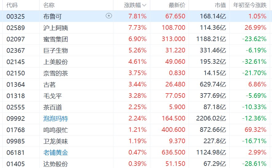 港股新消费概念股集体活跃,蜜雪集团涨近7%
