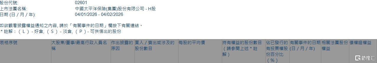 格隆汇2月4日丨根据联交所最新权益披露资料显示,2026年1月29日,中国太保(02601.HK)遭JPMorgan Chase & Co.以每股均价39.4277港元减持好仓174.46万股,涉资约6878.6万港元。