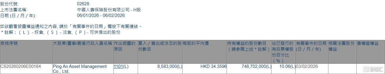 格隆汇2月6日丨根据联交所最新权益披露资料显示,2026年2月3日,中国人寿(02628.HK)获Ping An Asset Management Co., Ltd.在场内以每股均价34.3596港元增持858.3万股,涉资约2.95亿港元。