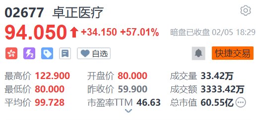 卓正医疗(2677.HK)将于明日(2月6日)在港上市,富途行情显示,该股暗盘段收报94.05港元,较招股价59.9港元大涨57.01%,每手50股,不计手续费,一手赚1707.5港元。