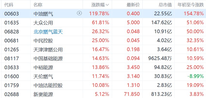 港股异动丨卡塔尔设施停运推升气价,燃气股集体疯狂,中油燃气飙升120%,大众公用暴涨超61%