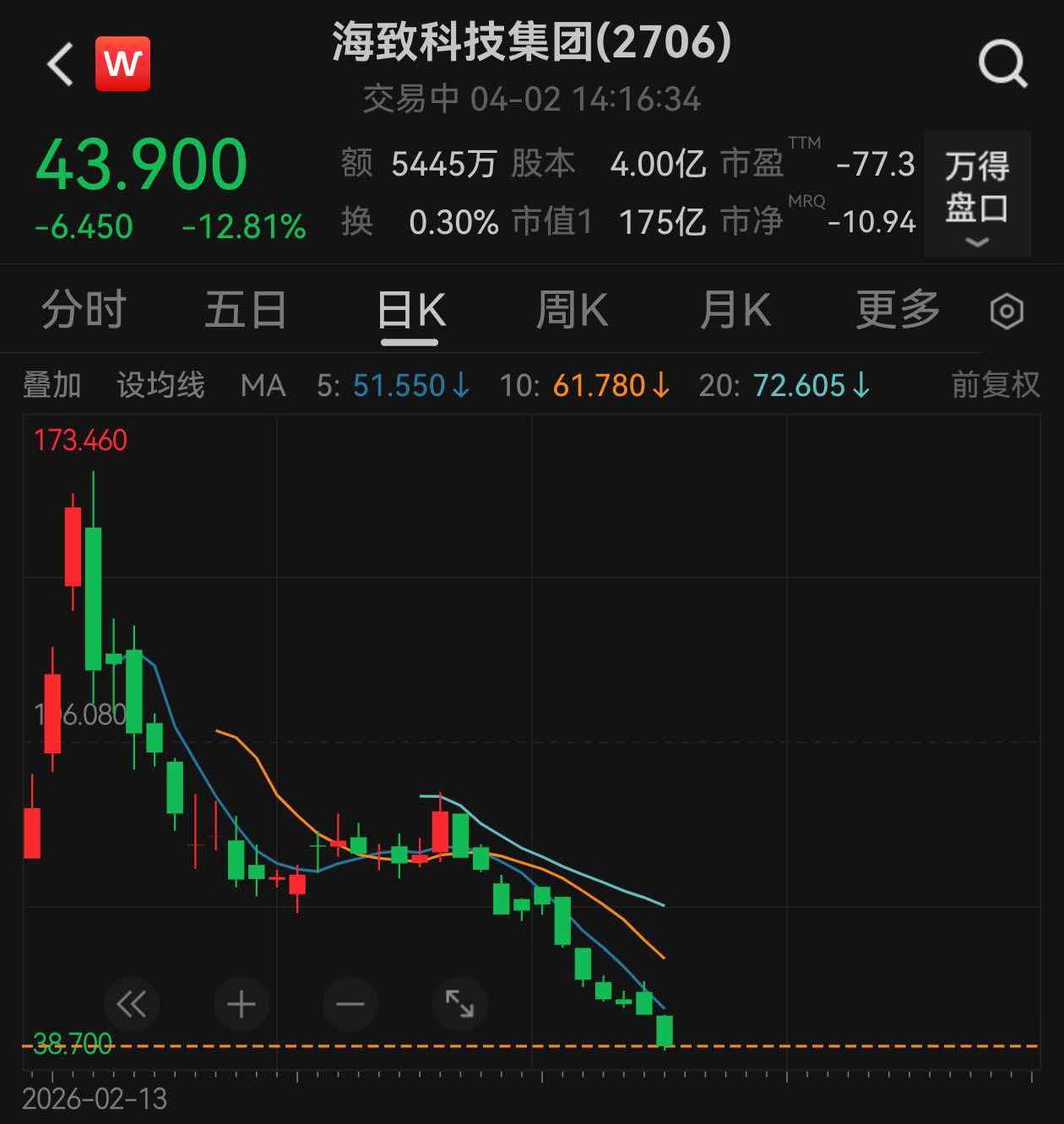 2月13日在港交所上市之初,海致科技集团的股价连续3日大涨。但在上市第4日,海致科技集团股价最高触及161.6港元后开启下跌。截至4月2日盘中,其股价最低跌至43.0港元。