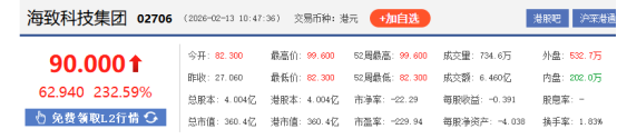 上证报中国证券网讯2月13日,海致科技集团正式登陆港交所,最终发售价为28港元/股。上市首日早盘,海致科技集团一度涨超260%,最高报99.6港元/股。截至10时47分,海致科技集团报90港元/股,涨232.59%,总市值约360.4亿港元。