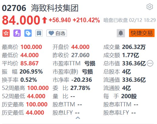 海致科技集团(2706.HK)将于明日(2月13日)在港上市,富途行情显示,该股暗盘段收报84港元,较招股价27.06港元大涨210.42%,每手200股,不计手续费,一手赚11388港元。