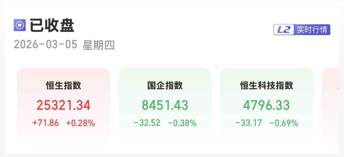 上证报中国证券网讯3月5日,港股三大指数涨跌互现。截至收盘,恒生指数涨0.28%,报25321.34点;恒生国企指数跌0.38%,报8451.43点;恒生科技指数跌0.69%,报4796.33点。