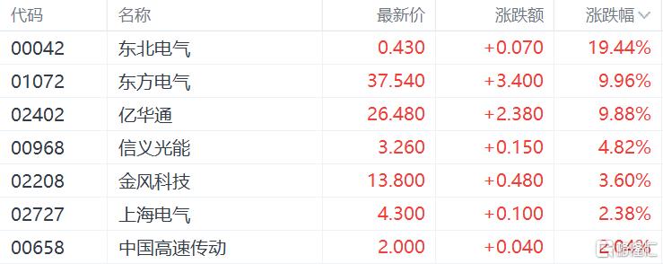 港股市场中,东北电气涨超19%,东方电气、亿华通涨超9%,金风科技、上海电气跟涨。