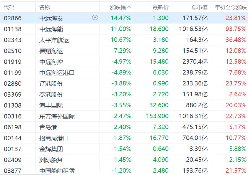 港股港口航运股集体回调,中远海发跌超14%