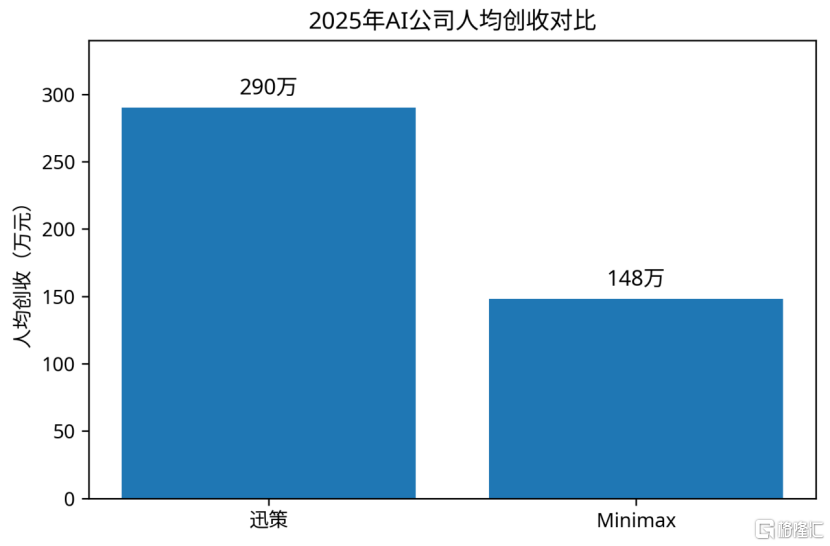 MiniMax招股书显示截至2025年9月底员工385人。2025年全年营收7904万美元(约5.7亿元人民币)。据此计算,人均创收约20.5万美元,按汇率7.2计算约147.8万元人民币。