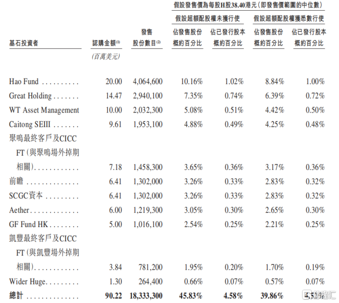 基石合计认购约9022万美元(约合7.04亿港元)的股份,按照发售价中位数38.40港元来计算,基石认购的比例为45.83%(假设超额配股权未获行使)。