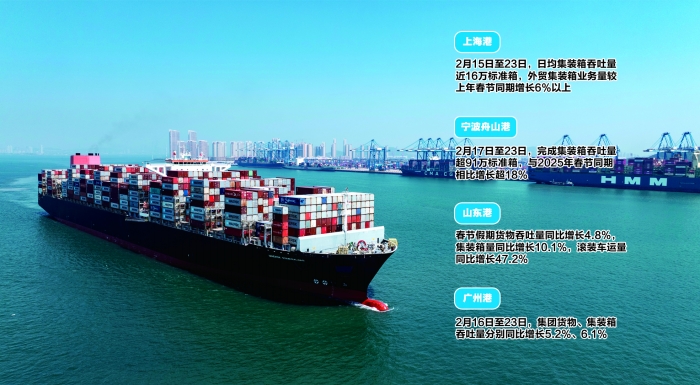 春节假期,宁波舟山港装卸作业24小时不间断,生产热潮涌动。宁波港相关负责人对上海证券报记者介绍,2月17日至23日,宁波舟山港完成集装箱吞吐量超91万标准箱,与2025年春节同期相比增长超18%。
