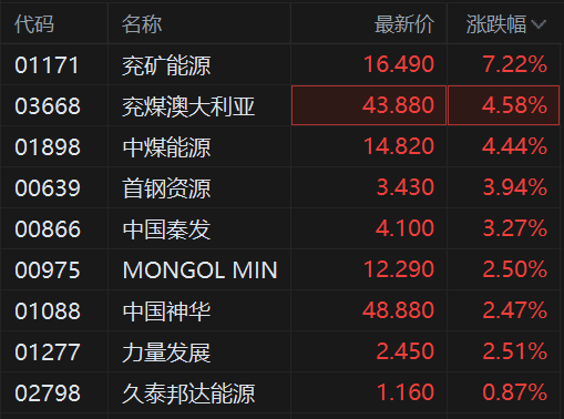 煤炭股拉升走强,其中,兖矿能源涨超7%领衔,