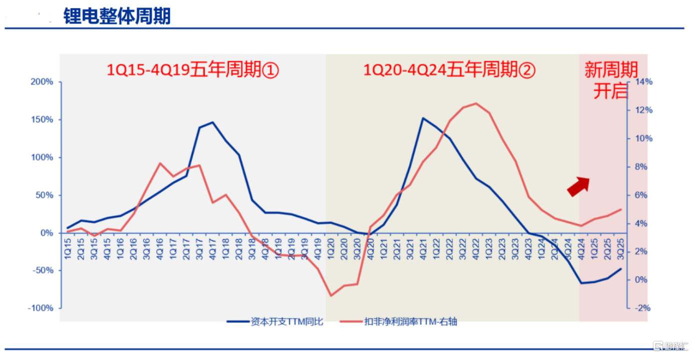 申万宏源研报指出:到2025年一季度,资本开支降幅边际趋缓,扣非净利率从低点开始拐头向上;进入三季度,季度扣非净利率保持修复态势,资本开支同比降幅进一步收窄。这意味着前几年行业扩产导致的产能过剩,正在被逐步消化;新增产能变得更加理性,而且扩出来的产能大多有订单需求作保障,行业已经进入“盈利预期向上、头部厂商资本开支企稳、行业供需平衡”的新周期。