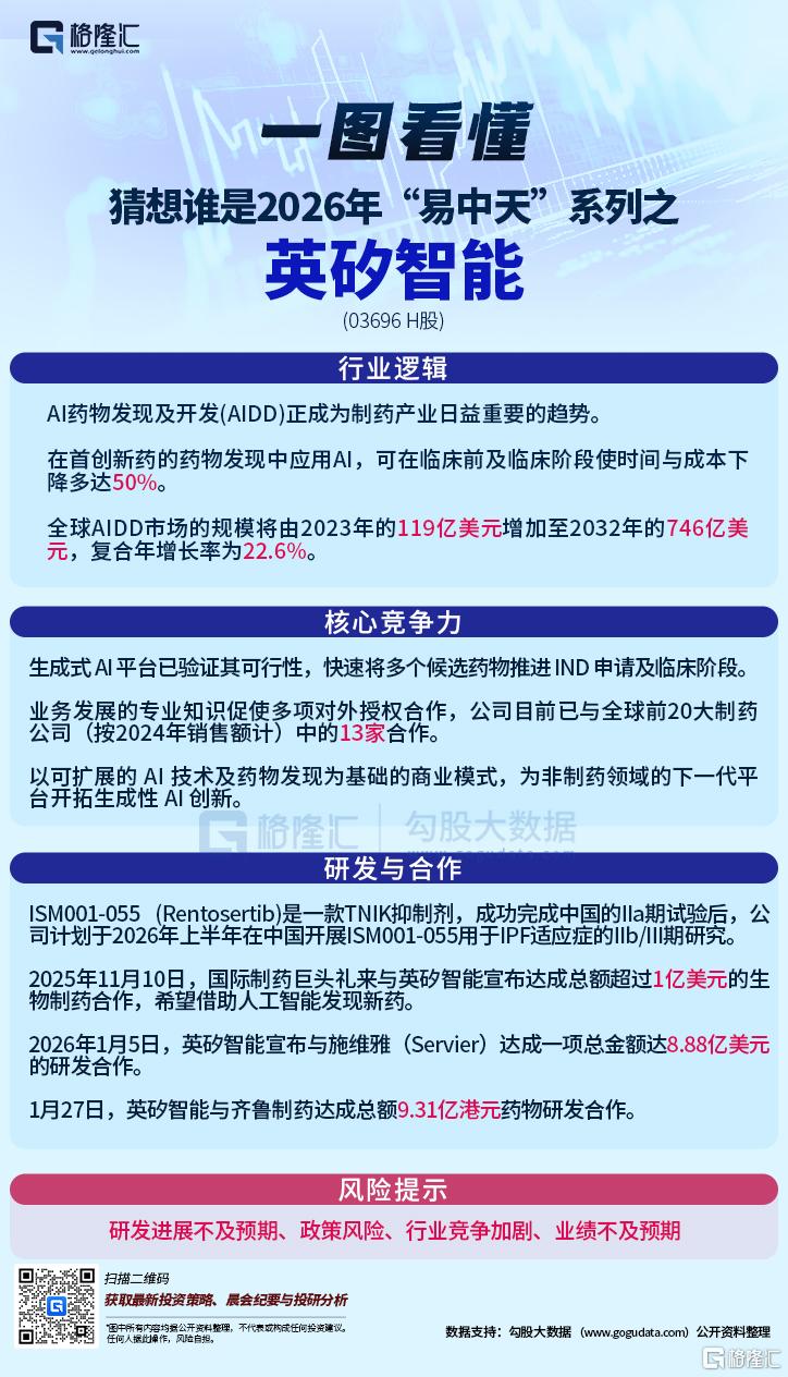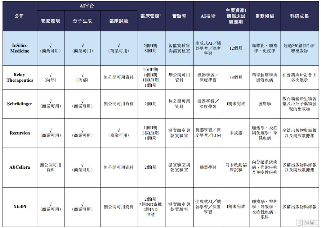 目前,公司已透过自主开发的生成式人工智能平台Pharma.AI产生逾20项临床或IND申报阶段的资产,其中三项资产已授权予国际制药及医疗保健公司,合约总价值最高为21亿美元,以及一项处于自主开发阶段的II期资产,在业界中处于相对较为先进的阶段。